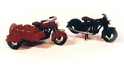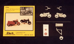 Our first project into HO vehicles was an extensive line of unique vintage motorcycle sets. Design, research and development began in 1996 with our first release in the fall of 2000. We've enclosed prototype photos of many of these unique sets along with our 1930s speedway race car. We intend to produce more of these period vintage vehicles in the future. Our goal is to fill a void with a unique item, not to rehash a vehicle already available.
